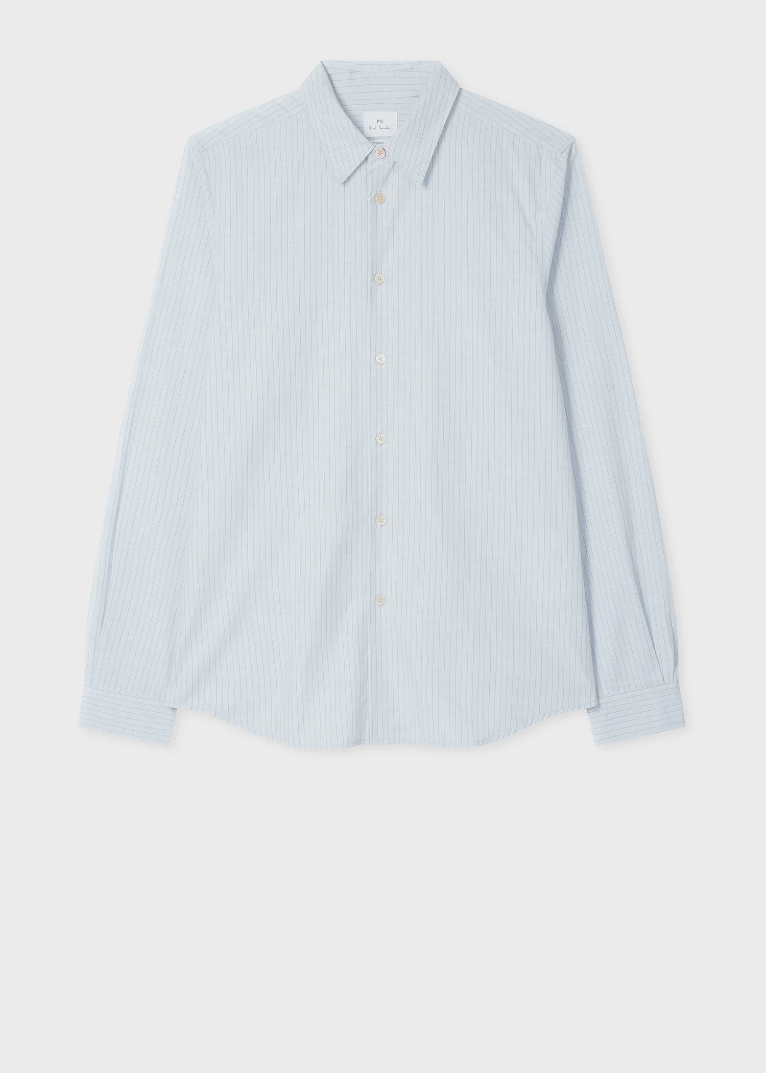 Made from 100% herringbone-twill cotton, this light blue shirt features a melange effect finish with an additional pinstripe detail. Cut for a tailored-fit, this casual shirt is finished with a soft point collar and a curved hemline with PS logo tab label. The Fit - Tailored-Fit Product Code: M2R-149T-T22490-40
