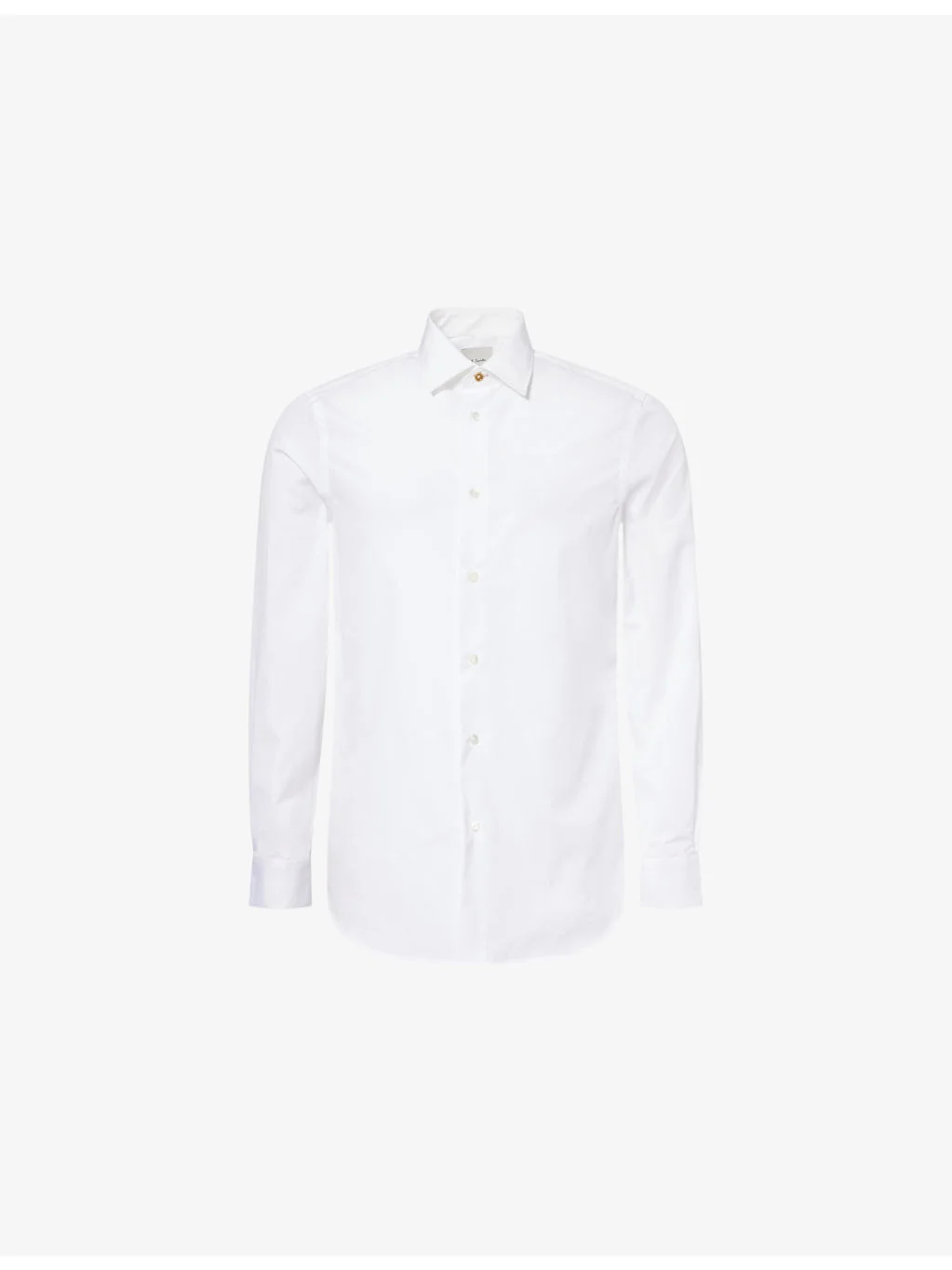 PRODUCT DETAILS - Paul Smith cotton-poplin shirt - 100% cotton - Exposed button fastening at front - Spread collar - Buttoned cuffs - Tailored fit, collar, long sleeves, straight yoke and pleats at back, curved hem - Machine wash at 30°C - Made in Italy - Size 15: length 30in / 77cm, chest 40in / 102cm - Model is 6ft 2in / 1.88m and wears a collar size 15 - Lightweight, stretchy Ref: R04536647