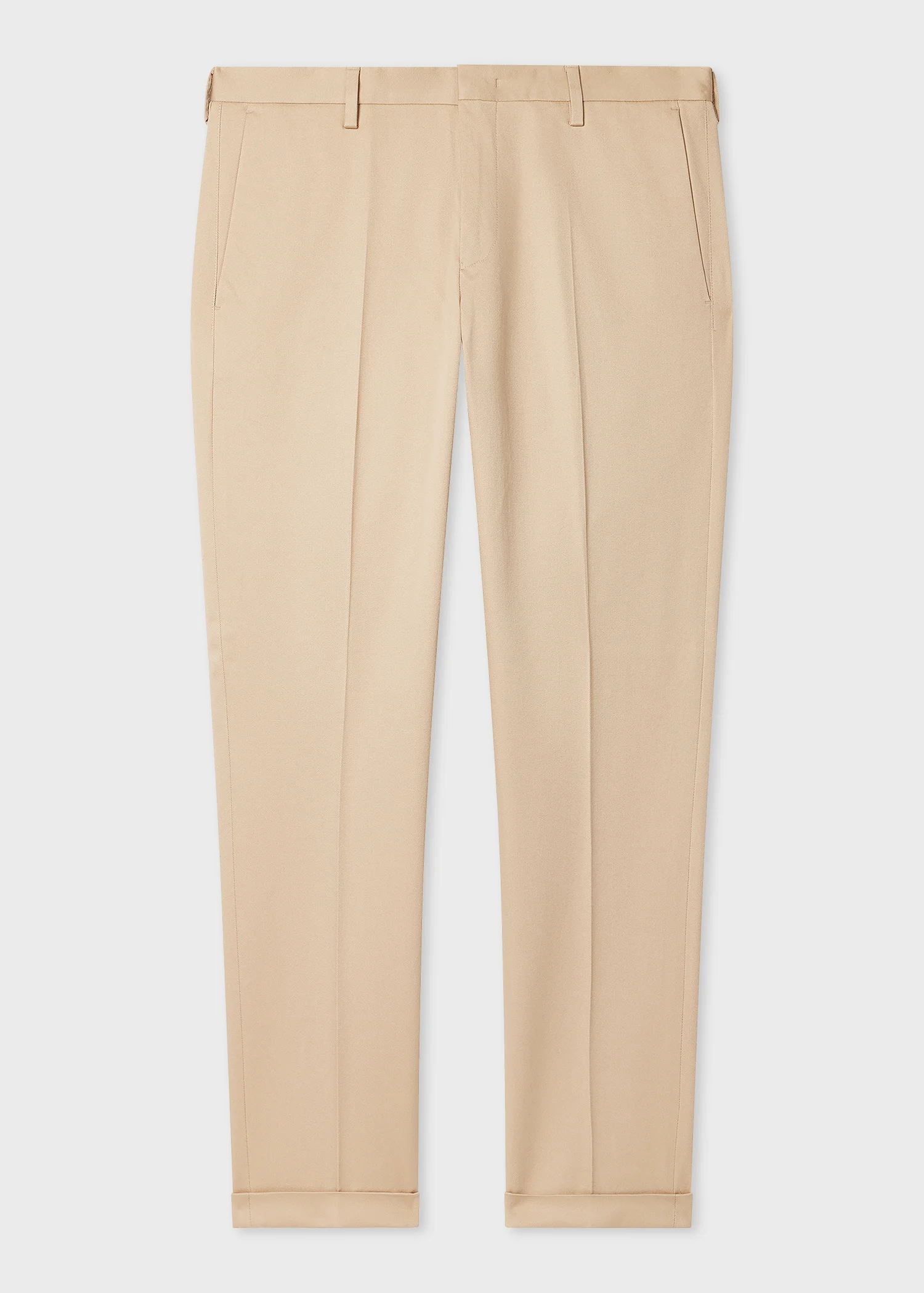 Made in Portugal from an organically grown cotton cloth with stretch for added comfort, these tan chinos feature classic styling with turn ups at the hem. Complete with two angled side pockets and finished with our 'Artist Stripe' tab on the reverse. The Fit Slim-Fit Low rise, cut slim from the hip through the leg with a narrow turn up hem. Product Code: M1R-255U-M02138-60A