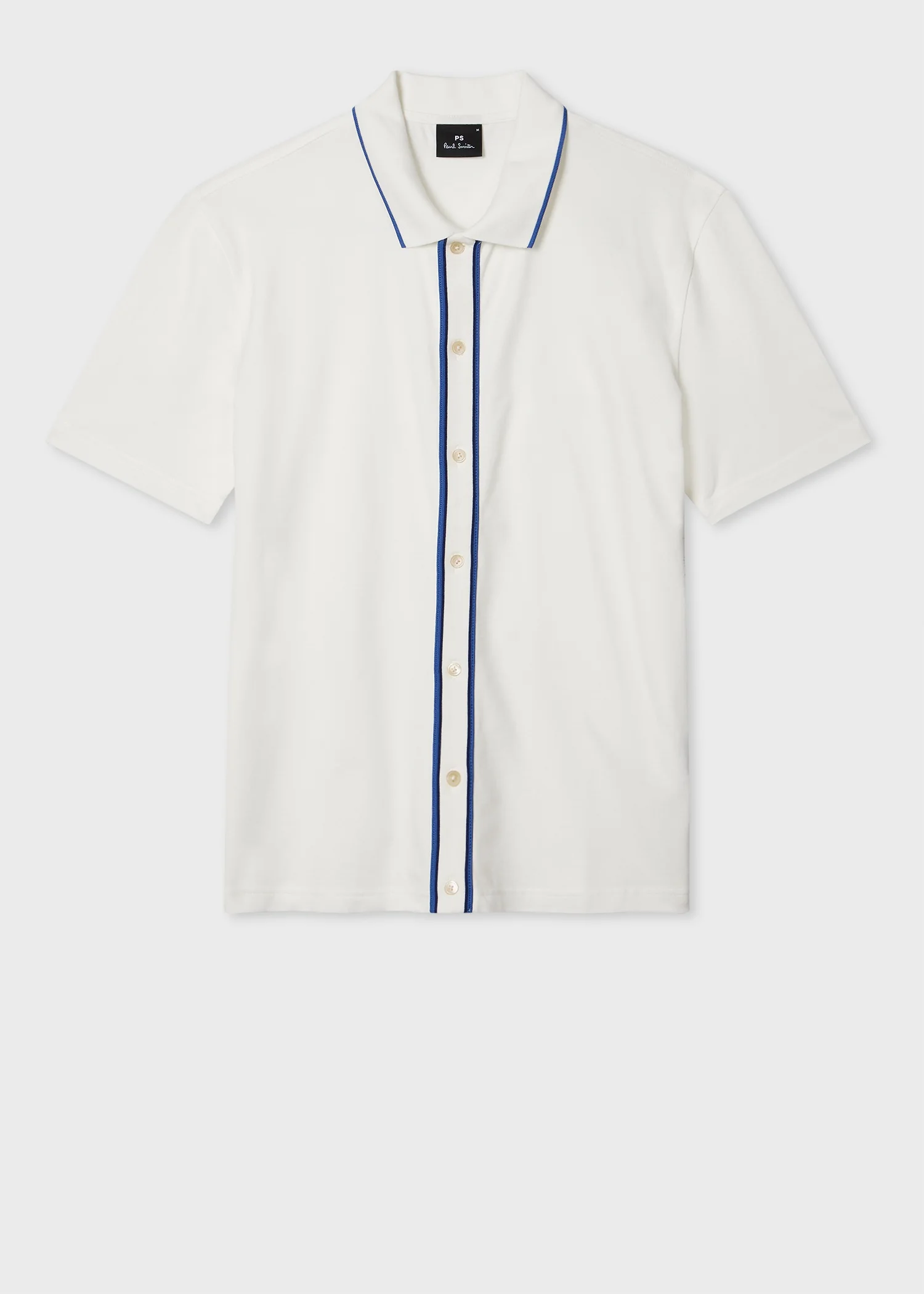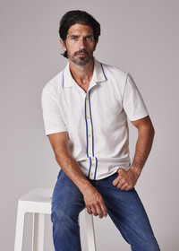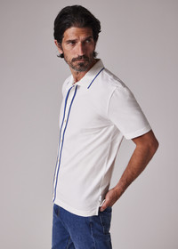 Made from soft organic cotton pique with stretch for added comfort, this white polo shirt features a full button placket. Finished with blue tipping on the placket and collar. The Fit - Regular-Fit is relaxed through the body. Product Code: M2R-787Y-T21511-02A