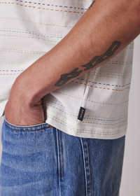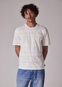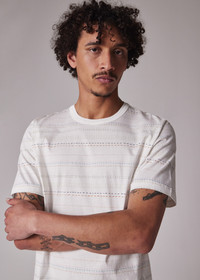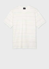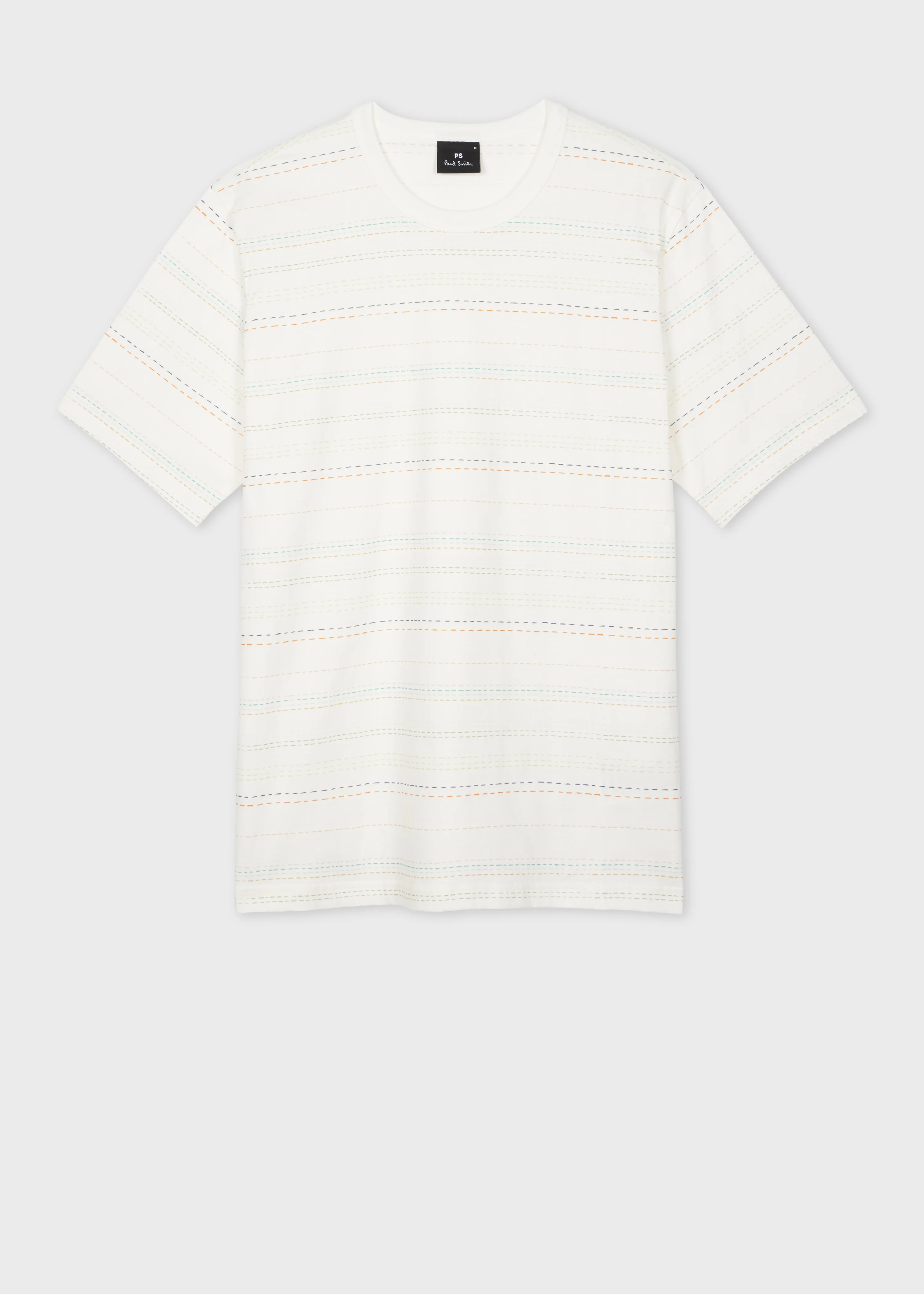 Made from organically grown cotton for a soft and comfortable fit, this white T-shirt features a muted multi-stripe pattern. Cut for a regular-fit, this T-shirt is finished with a stitched on ribbed collar and Paul Smith logo tab label. 100% Organically Grown Cotton Machine washable The Fit Regular-Fit is relaxed through the body. Product Code: M2R-220X-T22390-01