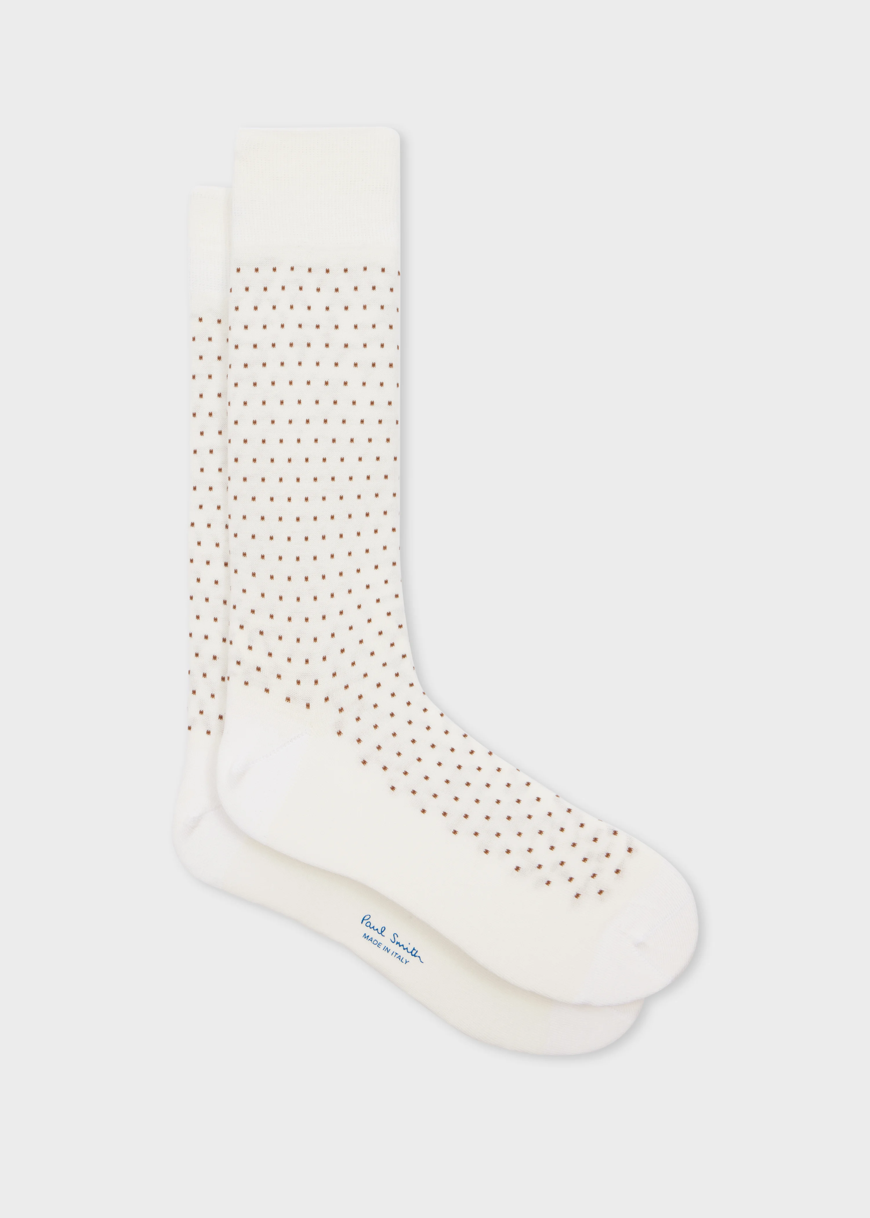 Made in Italy from a soft cotton-blend, these white socks feature a polka dot pattern throughout. Product Code: M1A-800MO-T684-02
