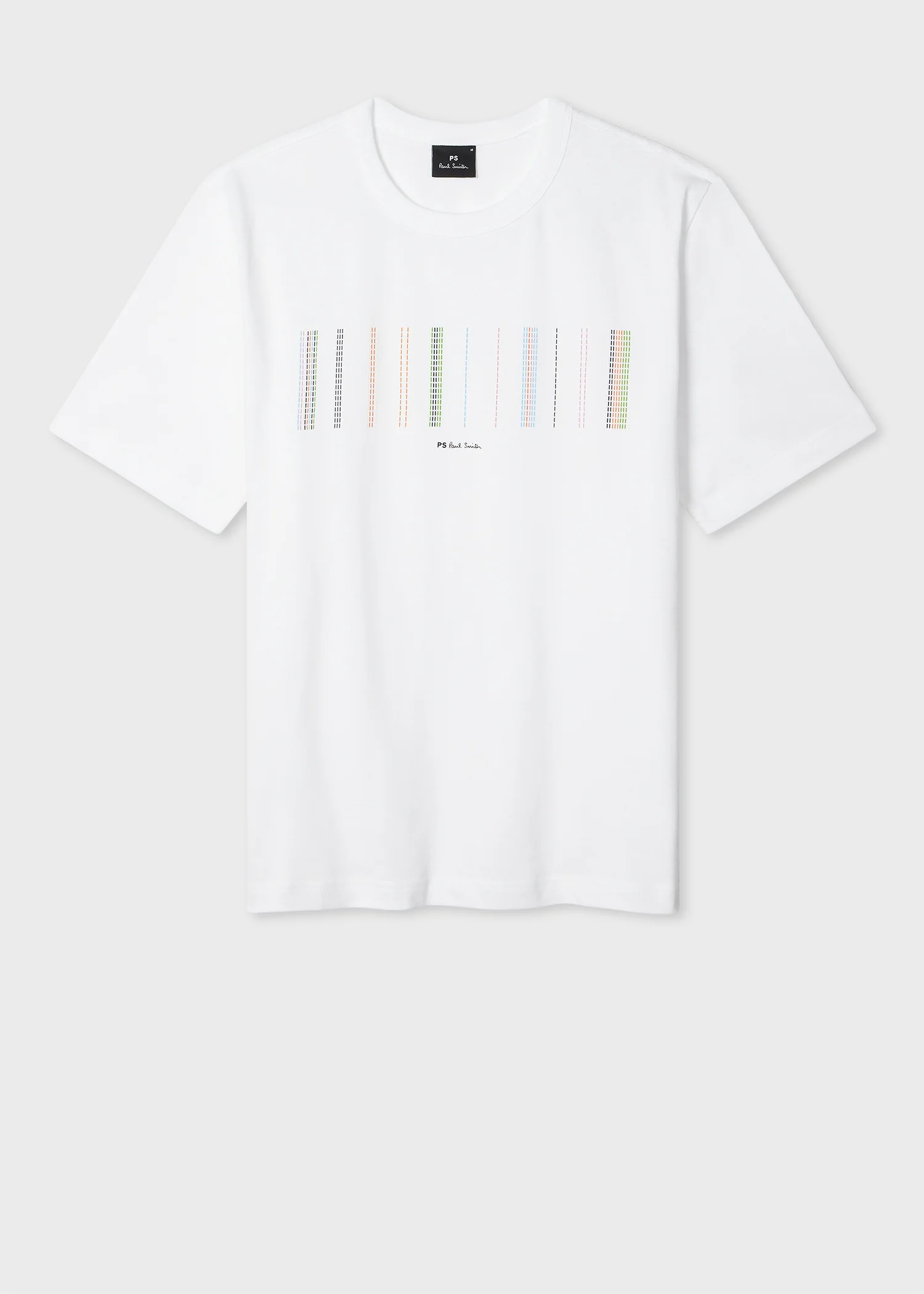 Made from 100% organic cotton with a heavier weight, this white crew neck T-shirt features our 'Stitch Stripe' print on the chest - creating a tactile finish. Cut for a regular-fit, this T-shirt is finished with a stitched-on ribbed collar 100% Organic Cotton Machine washable The Fit Regular-Fit is relaxed through the body. Product Code: M2R-220X-TP5159-01