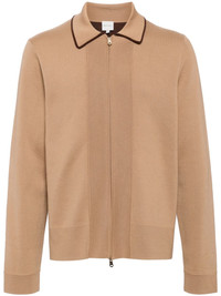 zip fastening cardigan Highlights - Peanut brown - Wool-cotton blend - Zip fastening - Embroidered logo at the sleeve - Piped-trim detailing - Long sleeves - Classic collar - Ribbed hem Imported Composition Wool 75%, Cotton 21%, Elastane 4% SIZE & FIT Model measurements Height 6 ft 2 in(1.89 m) Bust/Chest 35.03 in(89 cm) Hips 34.64 in(88 cm) Waist 28.34 in(72 cm) FittingInformation Designed for a relaxed fit, this piece allows for comfort and movement when worn Made with a midweight knit, this piece offers some stretch