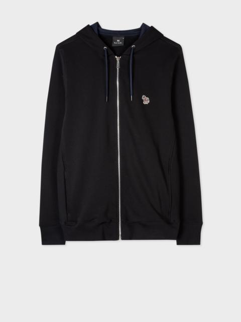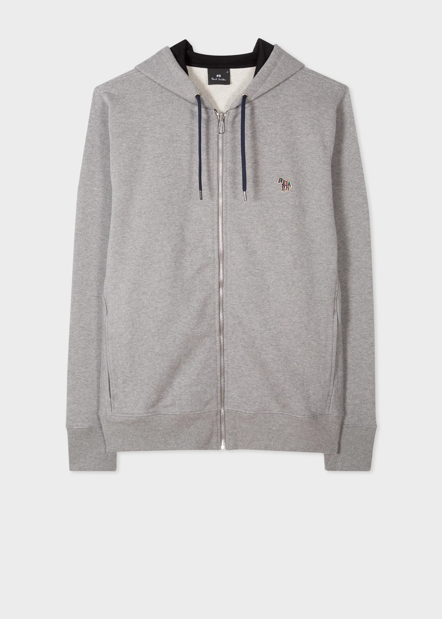 Constructed from 100% organically grown loopback-cotton, with a zip-through front - this grey mid-weight hooded sweatshirt comes complete with an embroidered zebra on the chest in an updated 'Sports Stripe' pattern, and subtle on-seam front pockets. Aglet-tipped navy drawstring Contrast internal chest and hood lining Ribbed cuffs and hem Knitted, 100% Organically Grown Cotton Machine washable Product Code: M2R-360R-KZEBRA-72