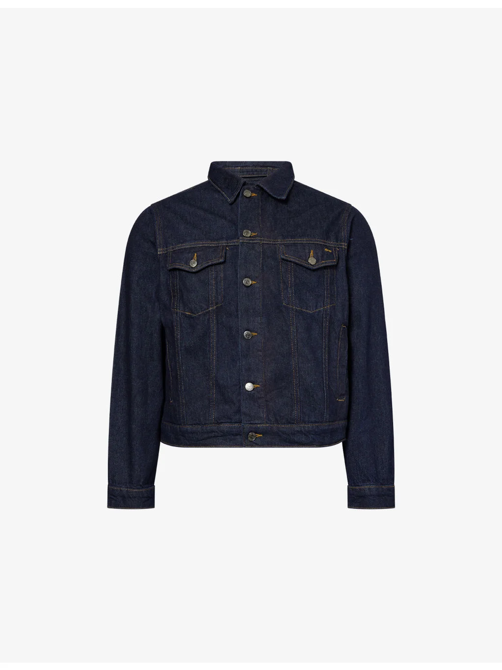 PRODUCT DETAILS - Percival denim jacket - 100% cotton - Button fastening - Pointed collar, long sleeves, buttoned cuffs, two buttoned flap pockets at chest, two welt pockets at front, all-over contrast topstitch, straight hem, brand patch at back - Machine wash at 30°C - Size medium: length 25.5in / 65cm, chest 42.5in / 108cm - Model is 6ft 2in/1.88m and wears a size medium - Midweight, non-stretch Ref: R04550157