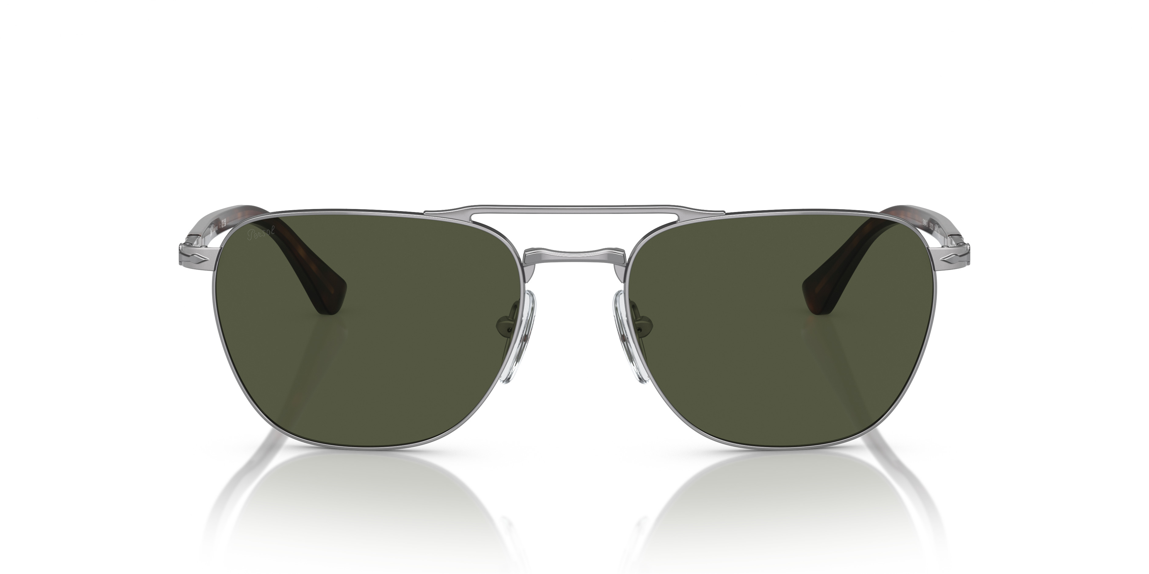 This metal pilot shape with distinct double bridge and top bar builds on past collections with fresh attitude for a standout look. MODEL CODE: PO2494S 513/31 55-18 FRONT COLOR: Gunmetal LENS COLOR: Green LENS MATERIAL: Crystal FRAME MATERIAL: Steel FIT: Narrow Fitting BRIDGE CHOICE & NOSEPAD: Adjustable Nosepads MADE IN: Italy
