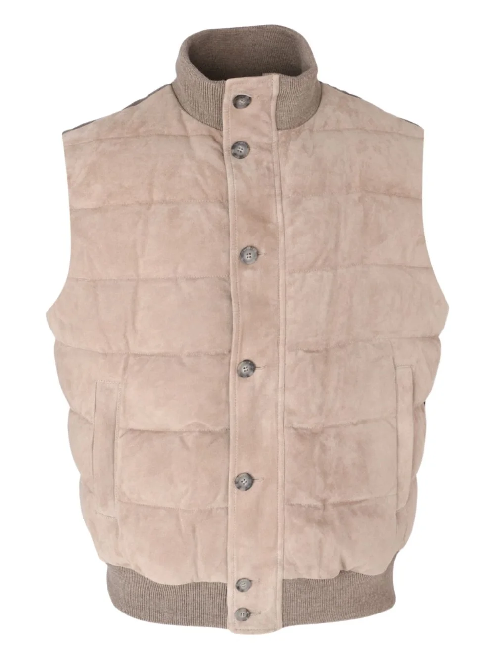 button padded vest Highlights - Brown - Button fastening - Ribbed collar and hem - Zip fastening - Two-way zip - Front welt pockets Made in Italy Composition Outer: Suede 100%, Virgin Wool 100% Lining: Polyester 100%, Cotton 100%, Goose Down 90%, Goose Feather 10% Washing instructions Read Manufacturer Guidelines