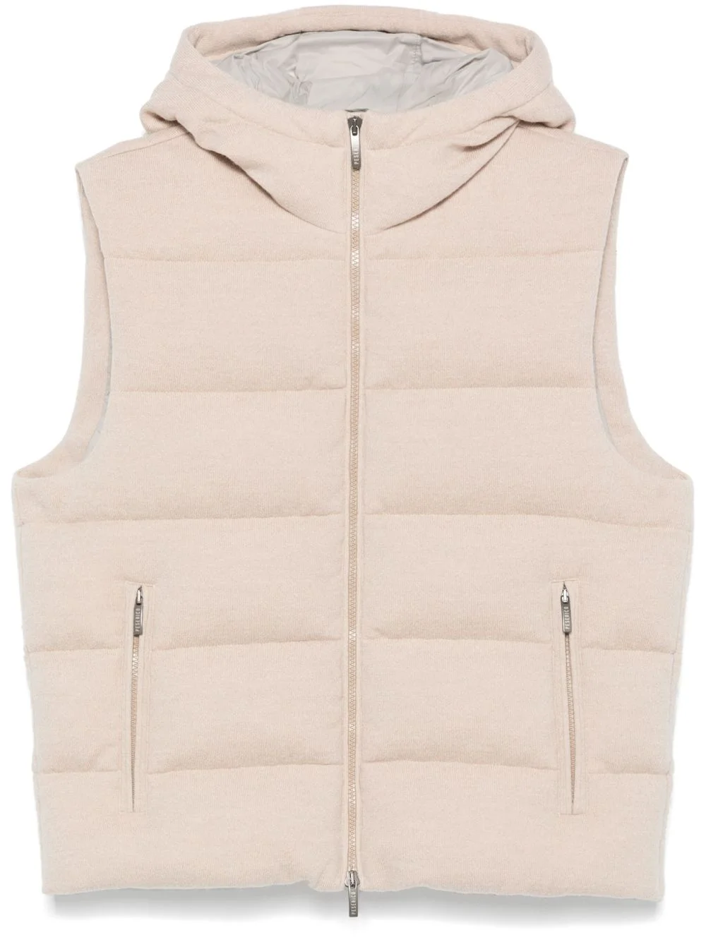quilted gilet Highlights - Light beige - Wool blend - Knitted construction - Quilted - Front two-way zip fastening - Classic hood - Sleeveless - Padded design - Two side zip-fastening pockets - Quilted lining - Straight hem Made in Italy Composition Outer: Wool 60%, Merino 30%, Cashmere 10% Lining: Nylon 100%, Goose Down 90%, Goose Feather 10% SIZE & FIT Model measurements Height 6 ft 1 in(1.85 m) Bust/Chest 35.82 in(91 cm) Hips 37.79 in(96 cm) Waist 29.13 in(74 cm) FittingInformation Designed for a regular fit, allowing for a comfortably loose fit throughout the body The internal drawstring at the hem allows for fitted preferences Made from a padded non-stretch fabric, giving it no natural elasticity Washing instructions Hand Wash