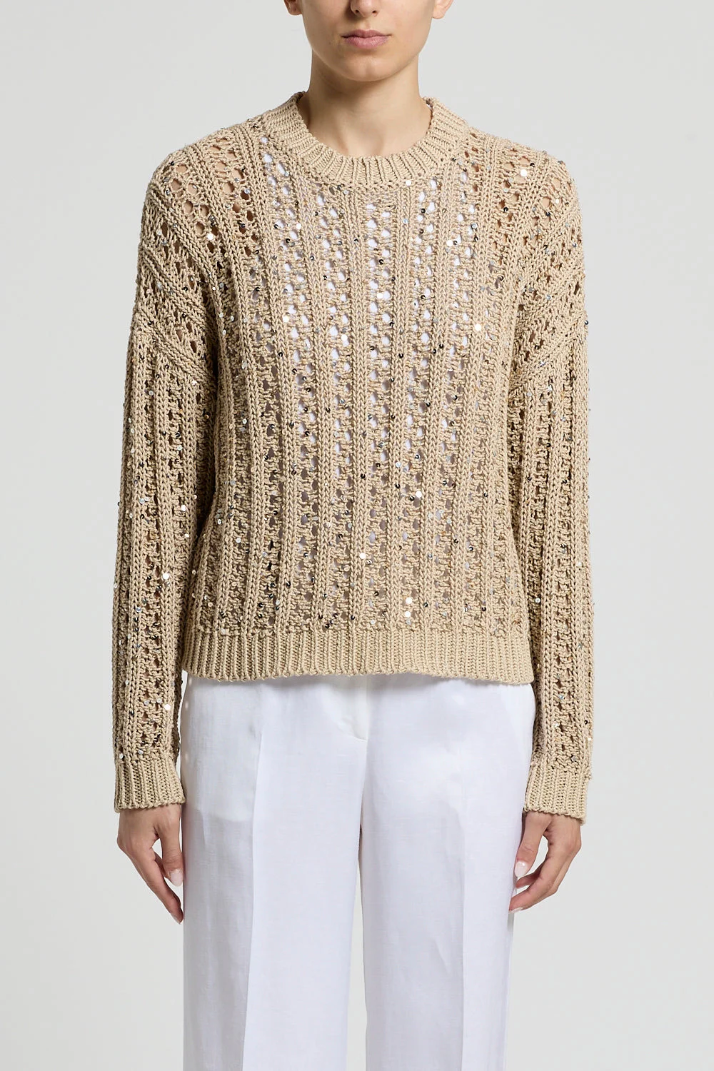 DETAILS AND INSIGHT Perserico round neck sequin sweater in golden beige. 100% Cotton Dry Clean Made In Italy Style A99071F03-GOLD