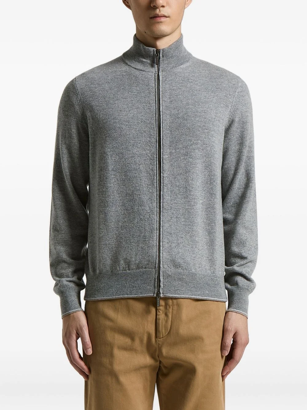 zip-fastening cardigan Highlights - Grey - Zip fastening - Ribbed hem - Ribbed cuffs - High neck - Long sleeves Made in Italy Composition Wool 90%, Cashmere 10% Washing instructions Read Manufacturer Guidelines