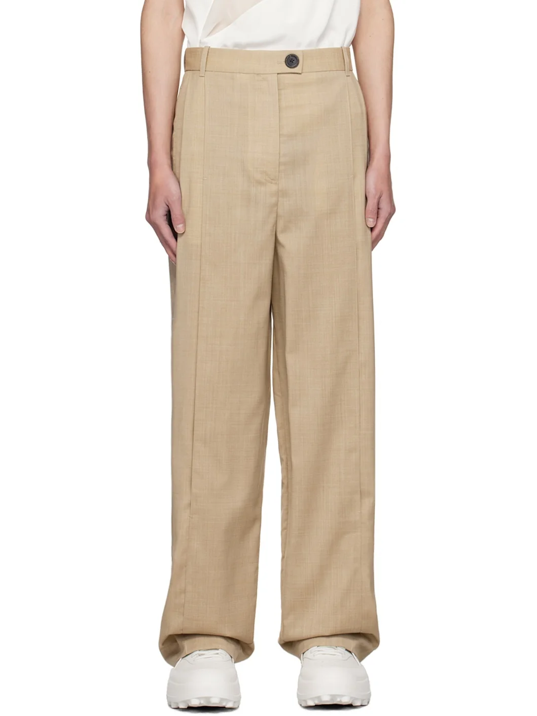 Virgin wool delaine trousers. · Belt loops · Four-pocket styling · Zip-fly · Vent at front legs · Unfinished hem · Pinched seam at back legs · Logo-engraved black hardware Supplier color: Taupe 100% virgin wool. Made in United States 242462M191002