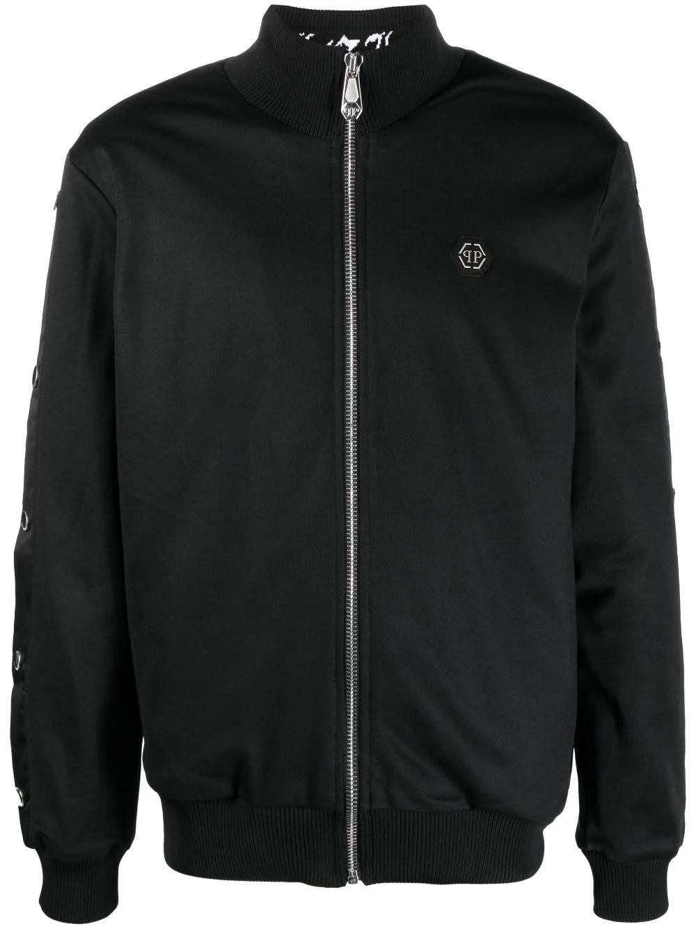 applique-detail bomber jacket Highlights - Black/grey - Applique detail - Logo plaque - Silver-tone stud detailing - High neck - Front zip fastening - Long sleeves - Elasticated cuffs and hem - Straight hem Imported Composition Polyester 95%, Elastane 5% SIZE & FIT Model measurements Height 6 ft 2 in(1.87 m) Bust/Chest 36.22 in(92 cm) Hips 37 in(94 cm) Waist 27.95 in(71 cm) FittingInformation Designed to be unstructured, offering a loose fit throughout The ribbed hem offers a close, comfortable fit Made from a midweight non-stretch fabric, this piece offers minimal elasticity when worn This piece fits true to size – take your usual size Washing instructions Hand Wash