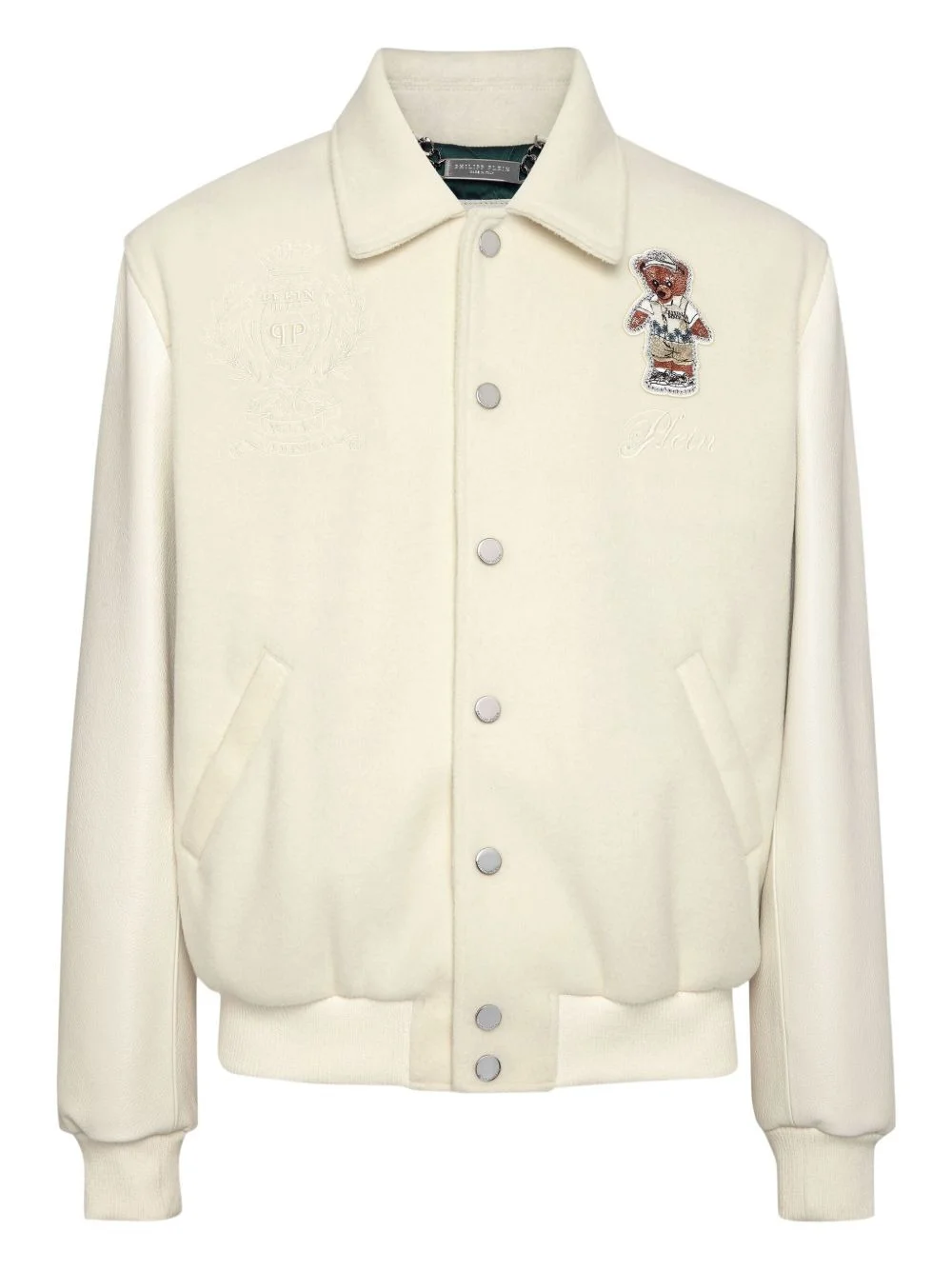 bear-embroidered jacket Highlights - Cream - Embroidered bear design - Logo detailing - Press stud fastening - Side pockets Made in Italy Composition Outer: Polyester 100%, Calf Leather 100% Lining: Polyester 97%, Elastane 3% Washing instructions Read Manufacturer Guidelines