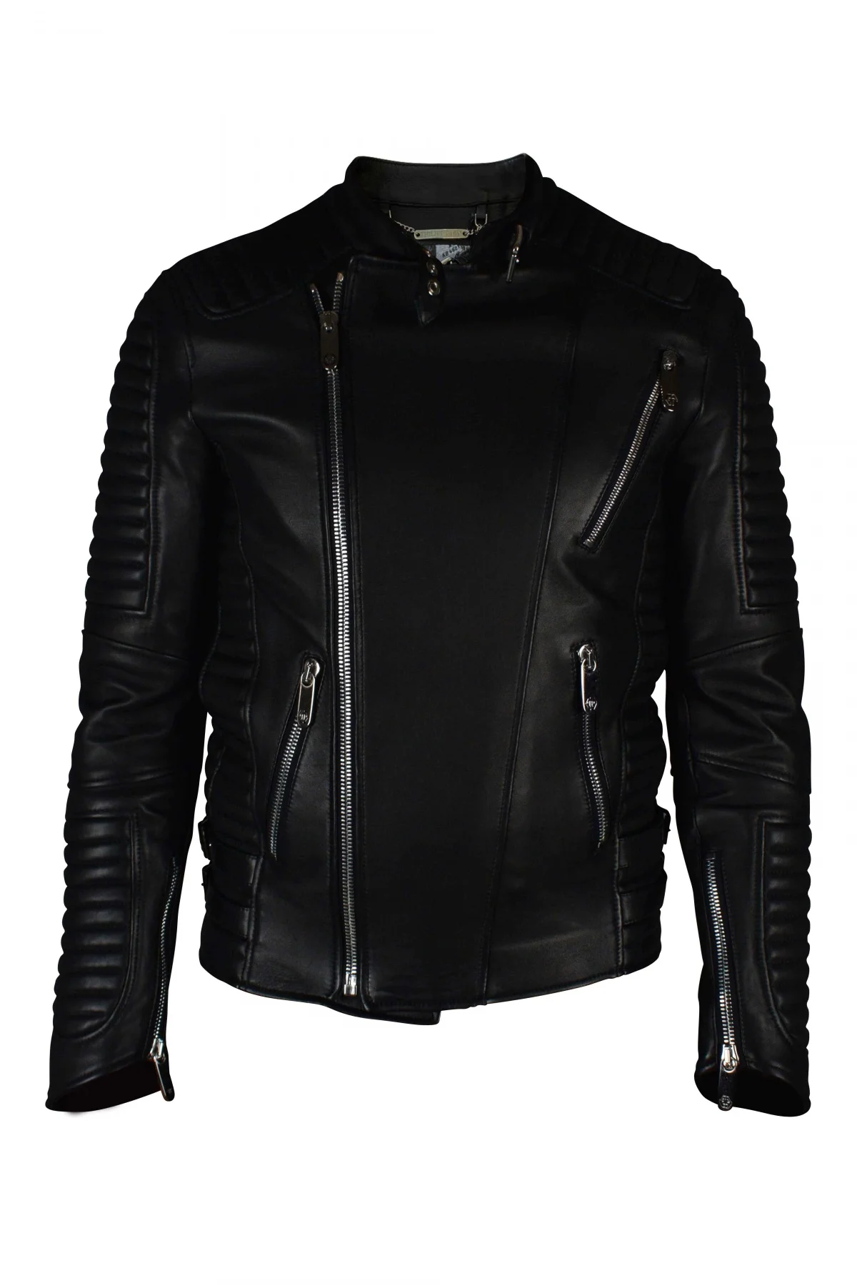 Philipp Plein biker jacket in black leather with zip closure. Leather inserts on the shoulders. Zipped sleeve closure. PP logo on the back. Pockets at the front. 100% leather. Made in Italy.