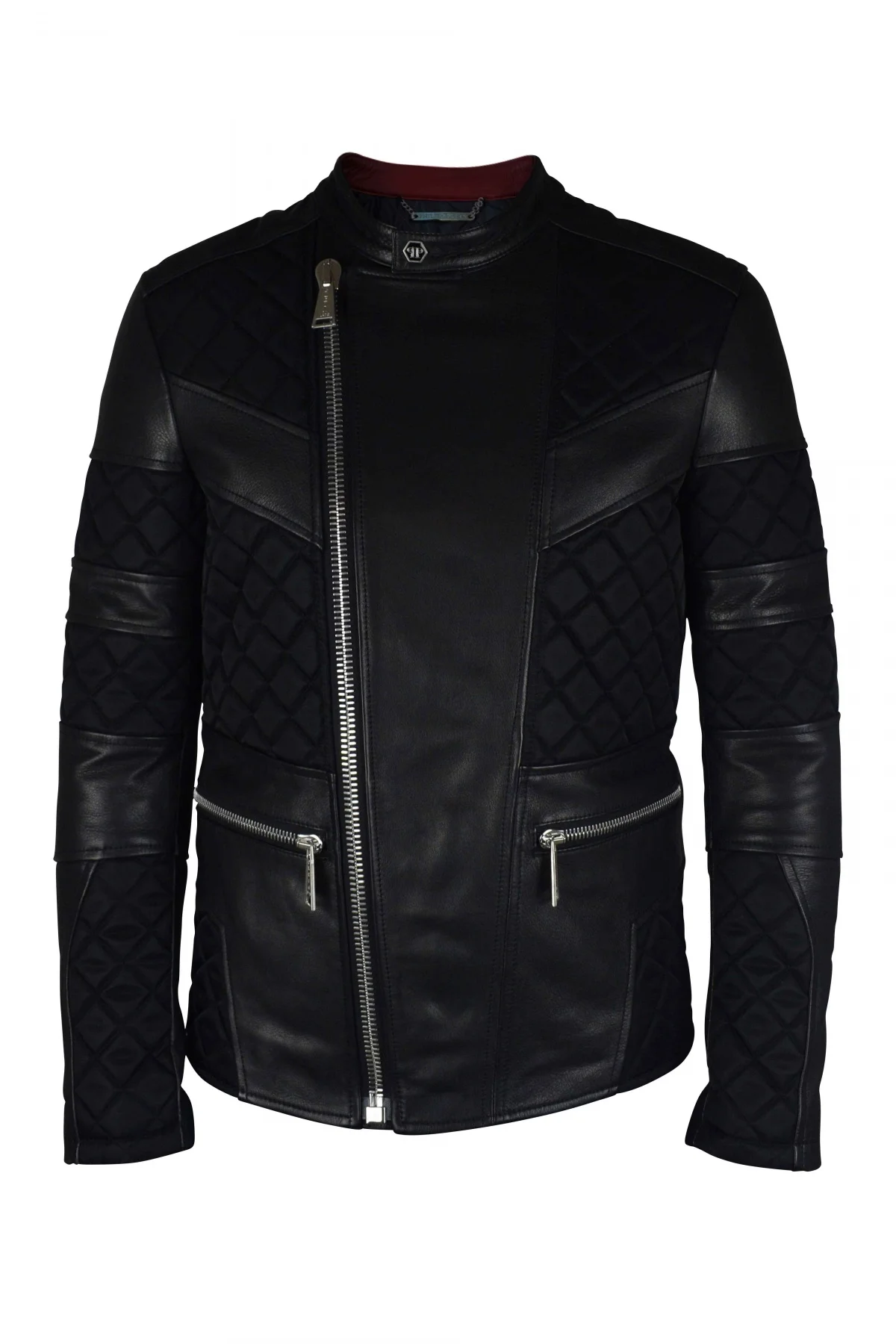 Philipp Plein biker jacket in black leather. Black quilted fabric panels. Zip and button closure at the collar. Zipped pockets. Zipped closure at the bottom of the sleeves. Made in Italy.