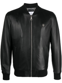 bomber leather jacket Highlights - Black - Calf leather - Band collar - Logo patch at the chest - Front zip fastening - Ribbed cuffs and hem - Straight hem Imported Composition Outer: Calf Leather 100%, Polyester 64%, Viscose 33%, Elastane 3% Lining: Polyester 100% SIZE & FIT Model measurements Height 6 ft 0 in(1.84 m) Bust/Chest 35.82 in(91 cm) Hips 37 in(94 cm) Waist 28.34 in(72 cm) Washing instructions Specialist Cleaning