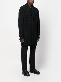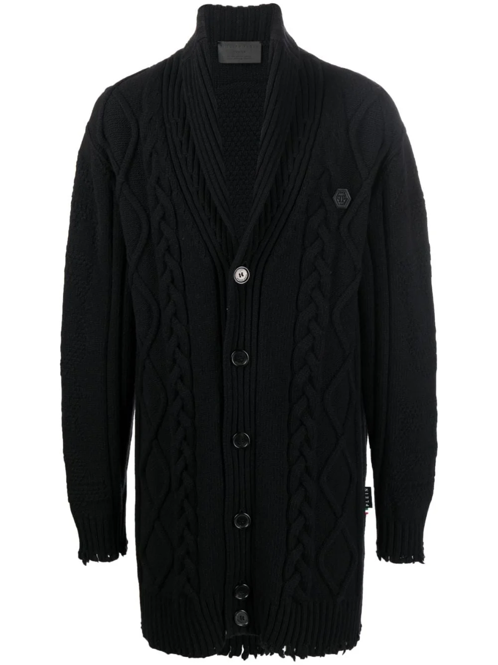 cable-knit distressed-finish cardigan Highlights - Black - Lambs wool - Cable knit - Knitted construction - Distressed finish - Logo patch at the chest - V-neck - Front button fastening - Long sleeves - Ribbed cuffs and hem Made in Italy Composition Lambs Wool 100% SIZE & FIT Model measurements Height 6 ft 0 in(1.84 m) Bust/Chest 35.82 in(91 cm) Hips 37 in(94 cm) Waist 28.34 in(72 cm) FittingInformation Designed for a relaxed fit, this piece allows for comfort and movement when worn Made with a midweight knit, this piece offers some stretch This piece fits true to size – take your usual size