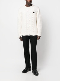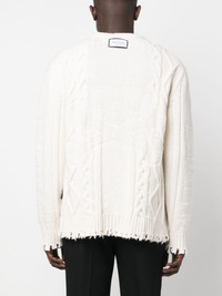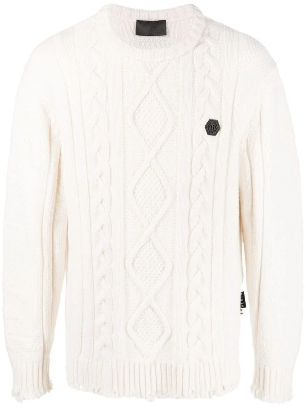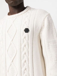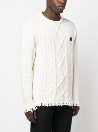 cable-knit distressed-finish jumper Highlights - Cable-knit distressed-finish jumper from philipp plein featuring off-white, cable knit, knitted construction, distressed finish, logo patch to the rear, logo patch at the chest, mini logo tag, long sheer sleeves, long sleeves, round neck and ribbed cuffs and hem. Made in Italy Composition Lambs Wool 100% SIZE & FIT Model measurements Height 6 ft 0 in(1.84 m) Bust/Chest 35.82 in(91 cm) Hips 37 in(94 cm) Waist 28.34 in(72 cm) FittingInformation Designed for a relaxed fit, this piece allows for comfort and movement when worn Made with a midweight knit, this piece offers some stretch This piece fits true to size – take your usual size Washing instructions Dry Clean Only