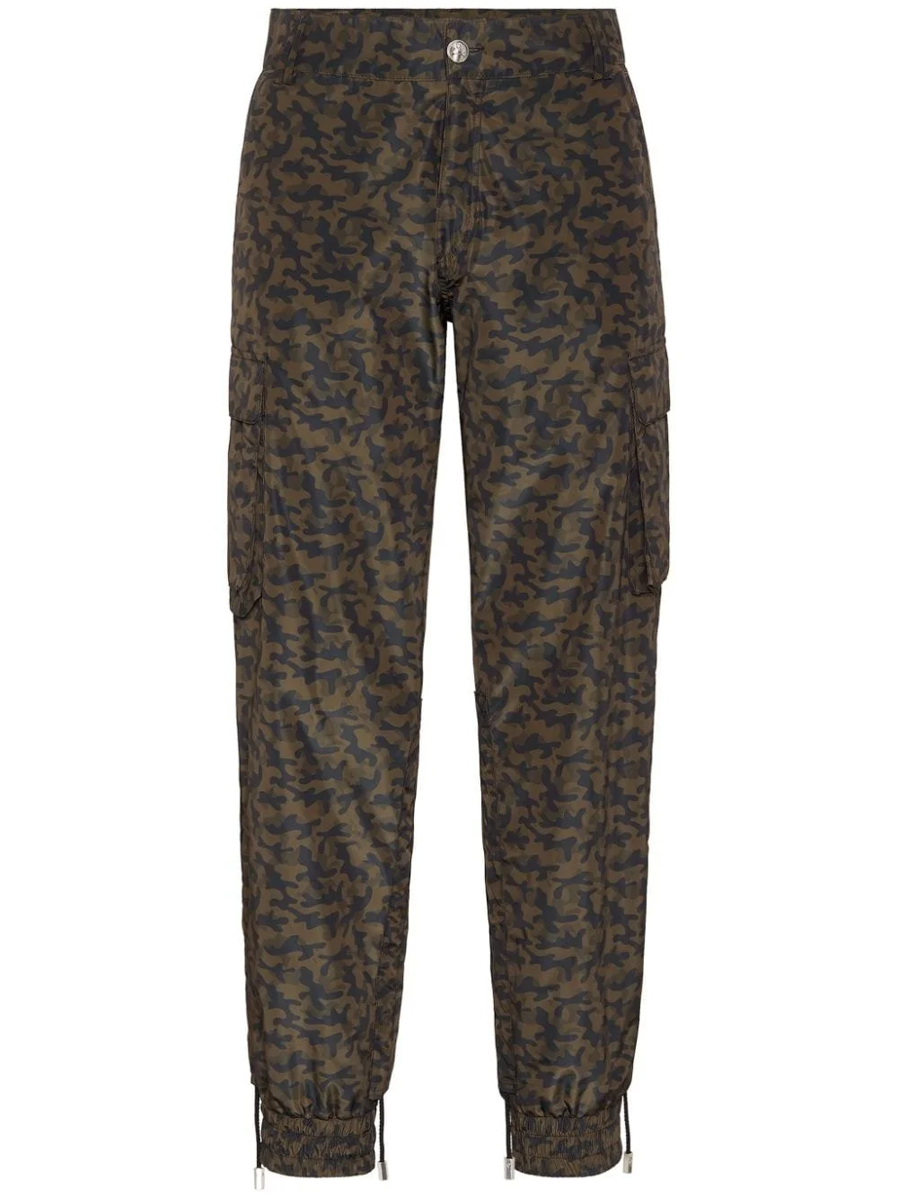 camouflage cargo trousers Highlights - Black/green - Camouflage pattern - Front button fastening - Belt loops - Two side cargo pockets - Concealed front zip fastening - Two rear flap pockets - Logo patch to the rear - Drawstring hem - Elasticated hem Made in Italy Composition Fabric 100% Washing instructions Read Manufacturer Guidelines
