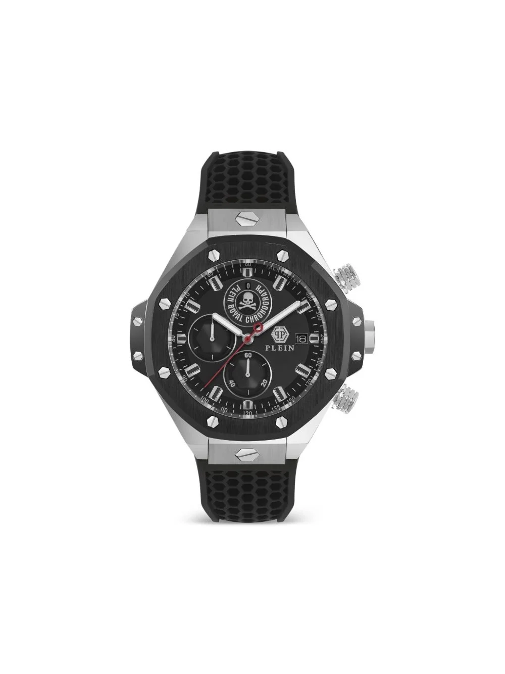 Chrono Royal 46mm Highlights - Stainless steel case - Quartz movement - Black - Baton dial - Baton hands - Engraved logo - Round face - Push-down crown - Tang-buckle fastening - Chronograph counters - Date indication - Water resistance up to 50m/5 atm - This item comes with a standard two-year warranty from the brand. Imported Composition Rubber 100%, stainless steel 100%