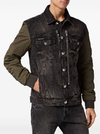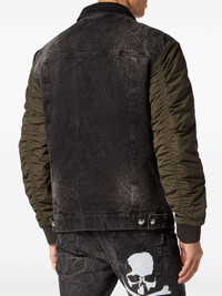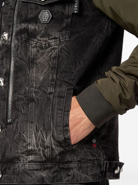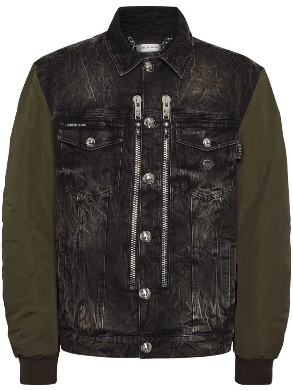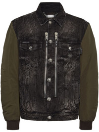 contrasting-sleeve denim jacket Highlights - Black/green - Cotton - Denim - Contrasting-fabric sleeves - Ruched detailing - Classic collar - Front button fastening - Decorative zip detailing - Logo patch at the chest - Two chest flap pockets - Two side welt pockets - Long sleeves - Ribbed cuffs - Straight hem Imported Composition Cotton 100% Washing instructions Read Manufacturer Guidelines
