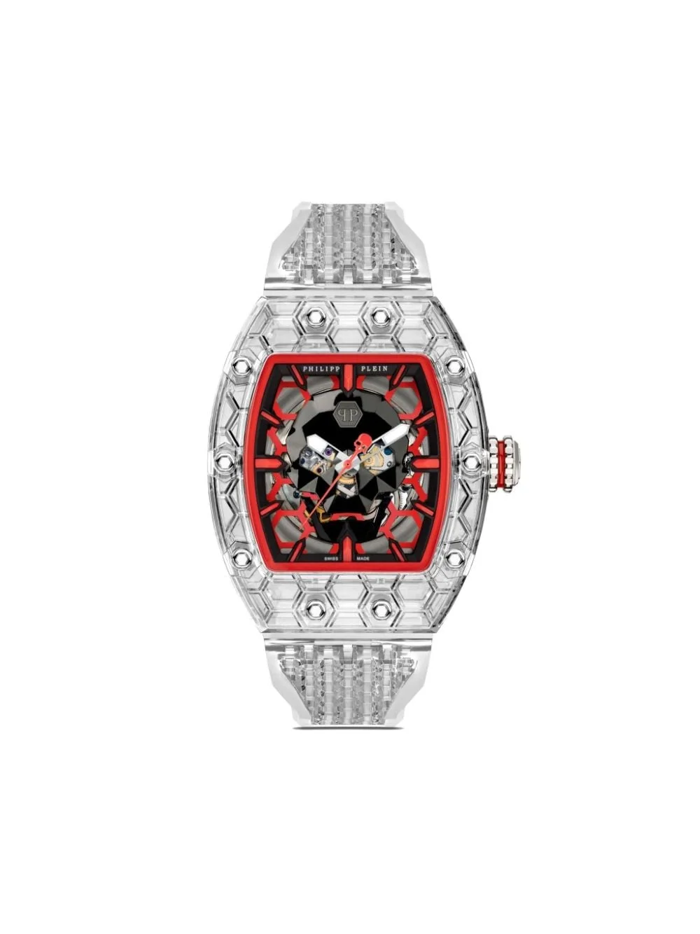 Crypto King CRY$TAL $LAYER 55mm Highlights - 55 x 45 mm - Grey/red - Stainless steel - Tonneau face - Skeleton dial - Baton dial - Baton hands - Automatic movement - Screw-down crown - Interchangeable strap - Pin-buckle fastening - Additional strap included. - This item comes with a standard one-year warranty from the brand. Imported Composition stainless steel 100%, Polyurethane 100%, Polycarbonite 100% SIZE & FIT Measurement DIAMETER 2.4 in(6.1 cm) Minimum Length 7.28 in(18.5 cm) Thickness 0.66 in(1.7 cm) TOTAL LENGTH 9.05 in(23 cm) WIDTH 1.1 in(2.8 cm)