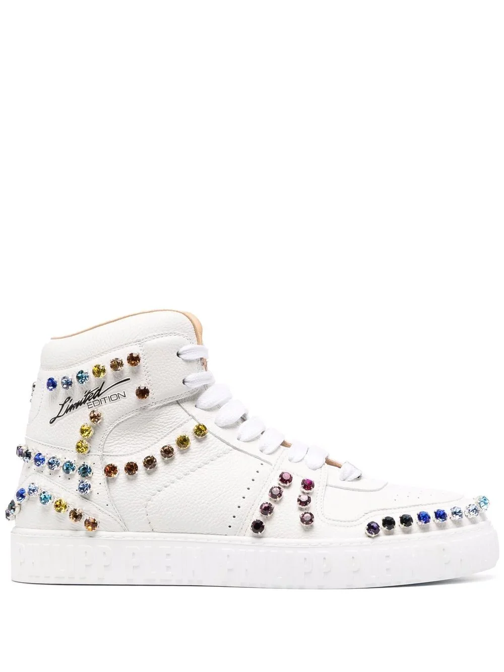 crystal-embellished high-top sneakers white leather crystal embellishment ankle-length round toe perforated toebox front lace-up fastening flat rubber sole Made in Italy Composition Outer: Calf Leather 100%, Fabric 100% Lining: Leather 100%, Thermoplastic Polyurethane (TPU) 100% SIZE & FIT Measurement HEEL 1.37 in(3.5 cm) HEIGHT 4.72 in(12 cm) Sole height 1.18 in(3 cm)