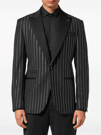 crystal-embellished single-breasted blazer Highlights - Jet black - Vertical stripe pattern - Crystal embellishment - Applique logo - Notched lapels - Front button fastening - Long sleeves - Buttoned cuffs - Jetted chest pocket - Two front welt pockets - Central rear vent Made in Italy Composition Lining: Viscose 51%, Acetate 49% Outer: glass 100%, Polyester 53%, Virgin Wool 43%, Elastane 4%