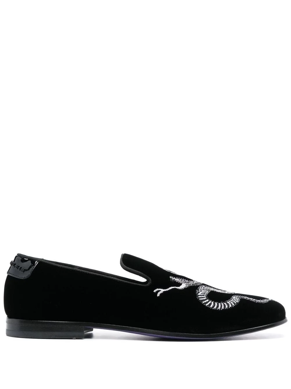 crystal snake loafers black calf leather patent finish crystal embellishment almond toe branded heel counter leather sole Made in Italy Composition Outer: Calf Leather 100%, Viscose 65%, Cupro 35% Lining: Sheepskin 100%, Polyamide 100% Sole: Bovine Leather 100% SIZE & FIT Measurement HEEL 0.78 in(2 cm)