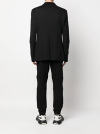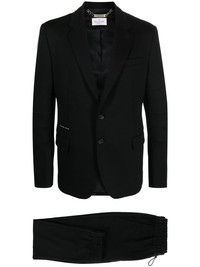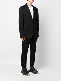 cuffed single-breasted suit cuffed single-breasted suit from PHILIPP PLEIN featuring black, tailored cut, silver-tone logo lettering, ribbed detailing, notched lapels, chest welt pocket, two front flap pockets, long sleeves, buttoned cuffs, central rear vent, slim cut, ribbed detailing, elasticated drawstring waistband, elasticated ankles and two diagonal pockets to the sides. Made in Italy Composition Lining: Polyester 65%, Viscose 51%, Acetate 49%, Cotton 35% Outer: Viscose 72%, Polyamide 23%, Spandex/Elastane 5% SIZE & FIT Model measurements Height 6 ft 2 in(1.87 m) Bust/Chest 35 in(89 cm) Hips 35 in(89 cm) Waist 28 in(71 cm) FittingInformation This piece fits true to size. We recommend you get your regular size Cut for a slim fit Made with a mid-weight fabric