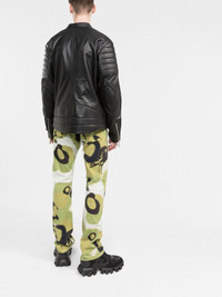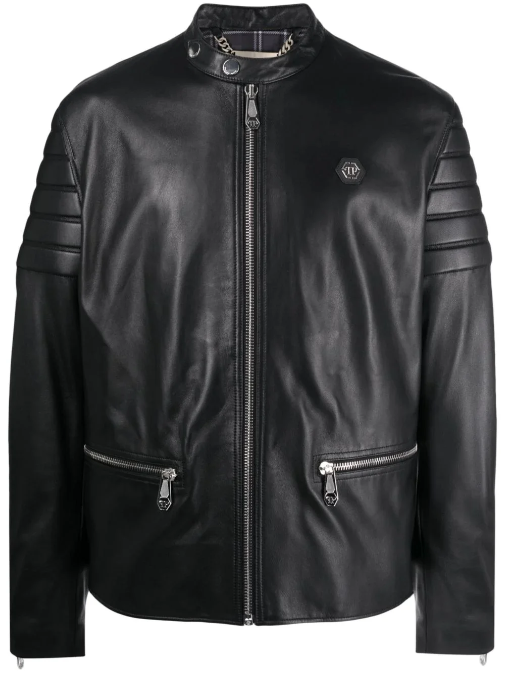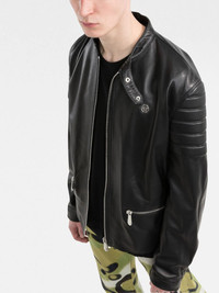 Doberman-print moto jacket Philipp Plein's collections are well known for its more is more aesthetic. Constructed from black leather, this jacket combines the classic features of a biker jacket with eye-catching detail, notice the Dobermanns-print lining. Imported Composition Lining: Polyester 97%, Spandex/Elastane 3% Outer: Lamb Skin 100% SIZE & FIT Model measurements Height 6 ft 2 in(1.88 m) Bust/Chest 37.79 in(96 cm) Hips 38.58 in(98 cm) Waist 29.52 in(75 cm) FittingInformation This piece fits true to size. We recommend you get your regular size Cut for a loose fit Made with a mid-weight non-stretch fabric Washing instructions Specialist Cleaning