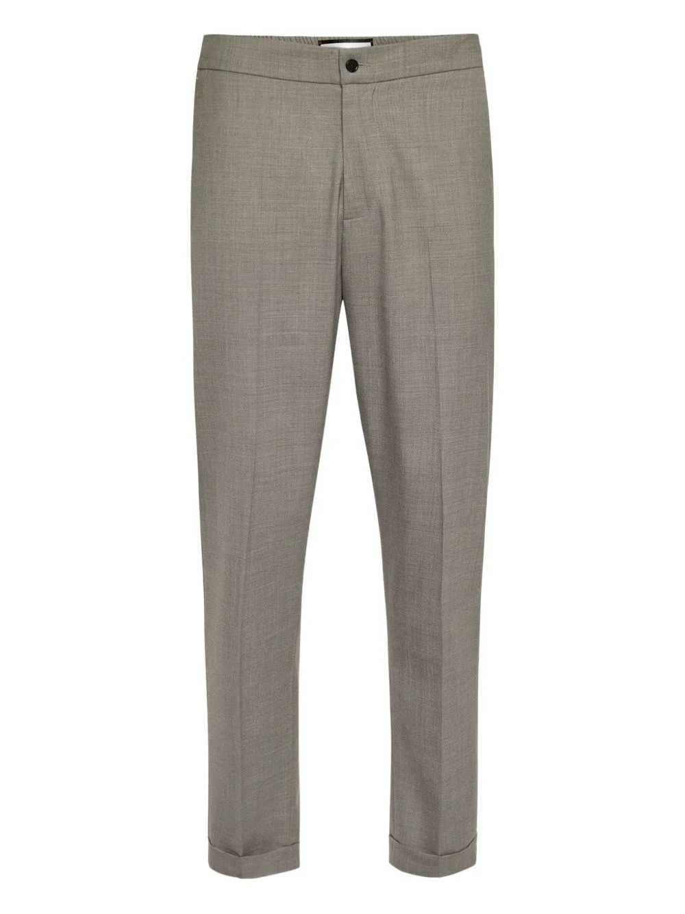 elasticated-waistband cuffed trousers Highlights - Grey - Elasticated waistband - Cuffed hems - Straight leg - Button fly - Rear logo plaque Made in Italy Composition Lining: Cotton 35% Outer: Polyester 65%, Linen/Flax 52%, Virgin Wool 46%, Elastane 2% Washing instructions Read Manufacturer Guidelines