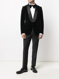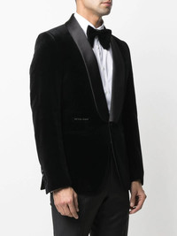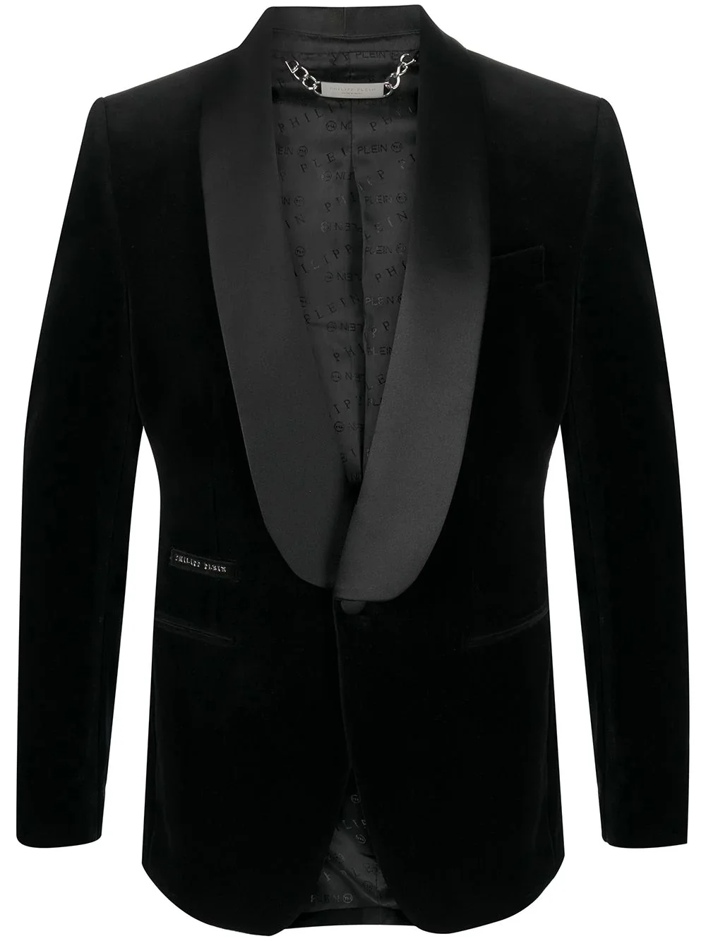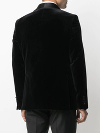 Elegant velvet-effect blazer Highlights - Black - Cotton - Velvet effect - Silver-tone logo lettering - Shawl lapels - Long sleeves - Front button fastening - Two side slit pockets - English rear vents - Full lining Made in Italy Composition Outer: Cotton 100%, Polyester 100% Lining: Viscose 51%, Acetate 49% SIZE & FIT Model measurements Height 6 ft 1 in(1.85 m) Bust/Chest 37.79 in(96 cm) Hips 37.4 in(95 cm) Waist 30.7 in(78 cm) FittingInformation This piece fits true to size. We recommend you get your regular size Cut for a slim fit Made with a mid-weight fabric Washing instructions Dry Clean Only