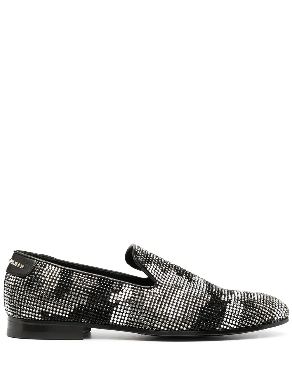 embellished camouflage moccasin loafers black/grey/silver-tone camouflage pattern crystal embellishment almond toe branded insole branded heel counter flat rubber sole low block heel Made in Italy Composition Sole: Rubber 100% Outer: Fabric 100%, Glass Fiber 100% Lining: Fabric 100% SIZE & FIT Measurement HEEL 0.78 in(2 cm)