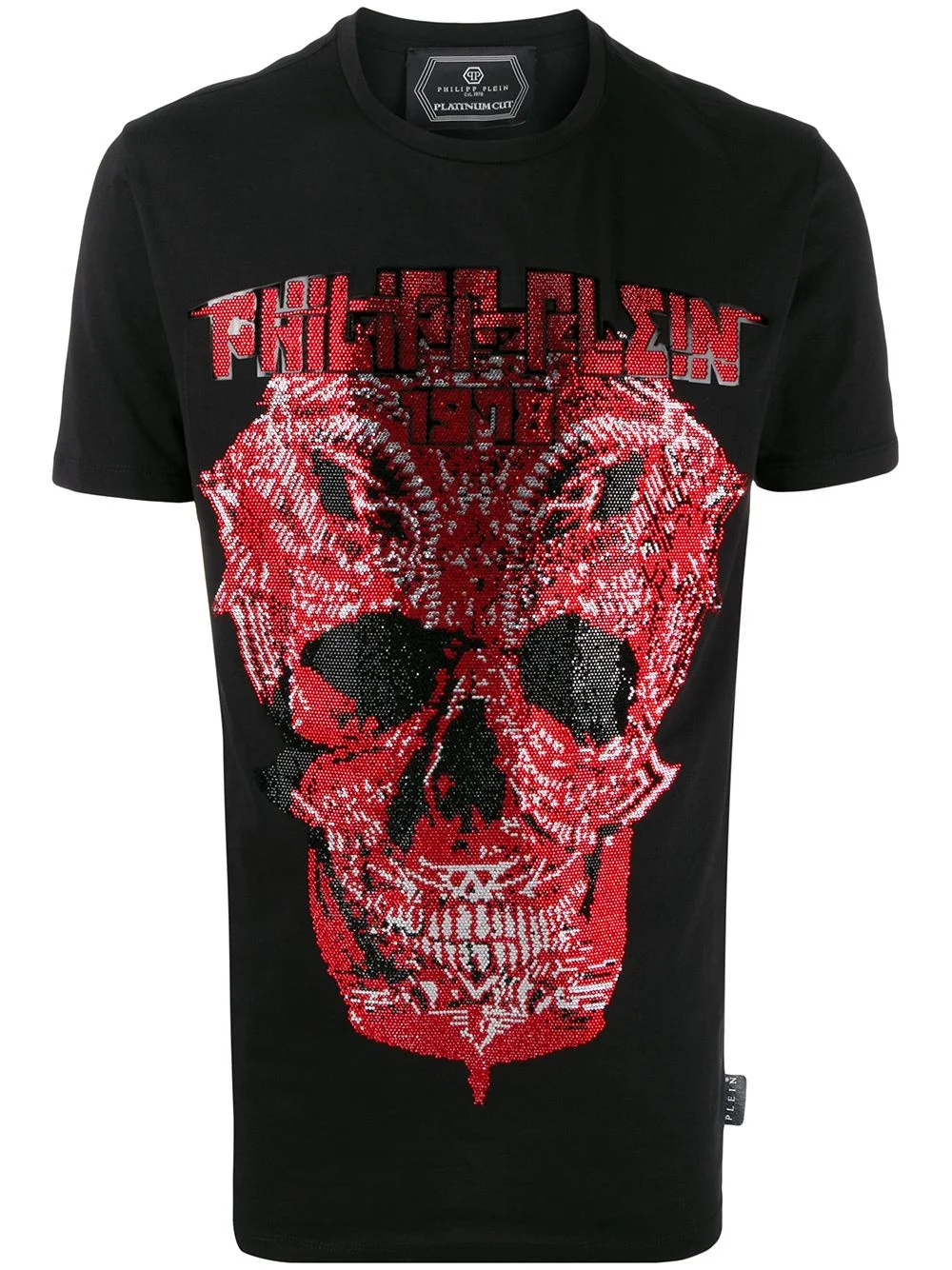 embellished skull short sleeve T-shirt Black and red cotton embellished skull T-shirt from Philipp Plein featuring a round neck, short sleeves and a front centre logo stamp. Imported Composition Cotton 100% Washing instructions Dry Clean Only