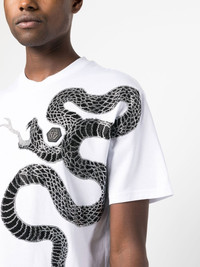embellished snake-print T-shirt white cotton rhinestone embellishment logo patch at the chest crew neck short sleeves straight hem Imported Composition Cotton 100% SIZE & FIT Model measurements Height 6 ft 2 in(1.88 m) Bust/Chest 36.61 in(93 cm) Hips 35.82 in(91 cm) Waist 27.95 in(71 cm) FittingInformation Designed to be unstructured, offering a loose fit throughout Made from a midweight non-stretch fabric, this piece offers minimal elasticity when worn This piece fits true to size – take your usual size Washing instructions Hand Wash