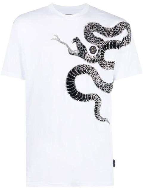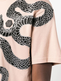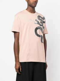 embellished snake-print T-shirt light beige cotton snake print crystal embellishment round neck short sleeves straight hem Imported Composition Cotton 100% SIZE & FIT Model measurements Height 6 ft 2 in(1.88 m) Bust/Chest 36.61 in(93 cm) Hips 35.82 in(91 cm) Waist 27.95 in(71 cm) FittingInformation Designed to be unstructured, offering a loose fit throughout Made from a midweight non-stretch fabric, this piece offers minimal elasticity when worn This piece fits true to size – take your usual size Washing instructions Hand Wash