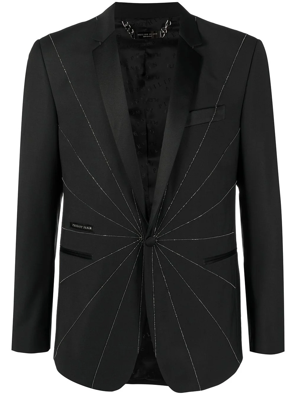 embellished tailored blazer black wool blend crystal embellishment notched lapels front button fastening long sleeves buttoned cuffs chest welt pocket two side inset pockets Made in Italy Composition Outer: Polyester 53%, Wool 43%, Spandex/Elastane 4% Lining: Acetate 50%, Viscose 50% Washing instructions Dry Clean Only