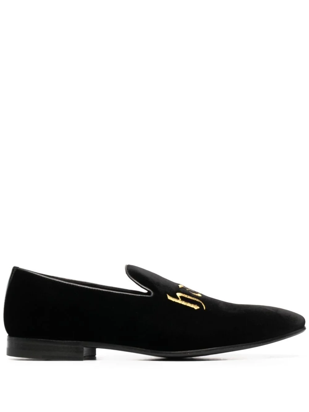 embroidered velvet loafers black/gold cotton/calf leather almond toe embroidered design slip-on style branded footbed stacked sole Made in Italy Composition Sole: Calf Leather 100% Lining: Leather 100% Outer: Cotton 100% SIZE & FIT Measurement HEIGHT 0.78 in(2 cm)
