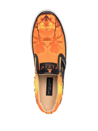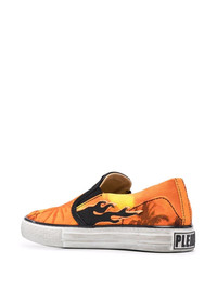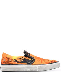 flame print slip-on sneakers orange leather flame print logo-print tongue slip-on style flat rubber sole Made in Italy Composition Outer: Other fibres 100% Lining: Calf Leather 100% Sole: Recycled Rubber 100% SIZE & FIT Measurement HEEL 1.37 in(3.5 cm) Sole height 1.18 in(3 cm)