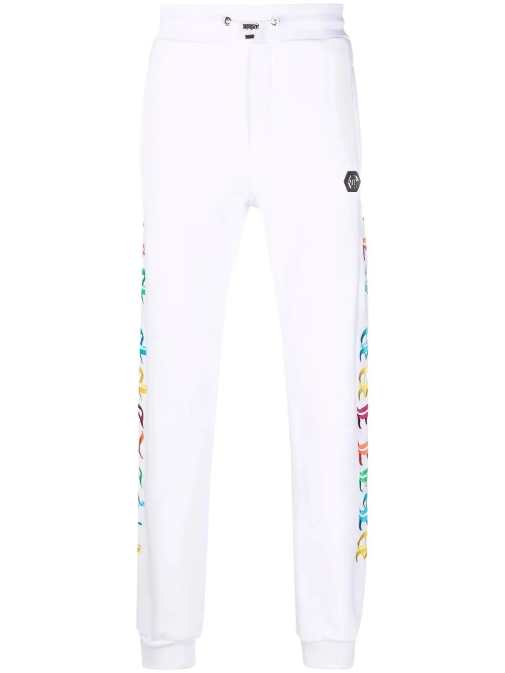 Gothic Plein logo track pants optical white cotton multicolour print drawstring fastening waist straight leg Imported Composition Cotton 100% SIZE & FIT Model measurements Height 6 ft 2 in(1.87 m) Bust/Chest 38.18 in(97 cm) Hips 36.61 in(93 cm) Waist 29.13 in(74 cm) Washing instructions Hand Wash