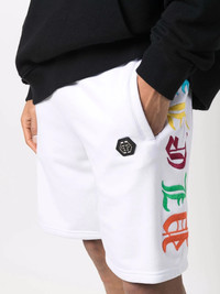 Gothic Plein track shorts In an unusually cheerful design for the brand, these Philip Plein drawstring shorts are accented with a signature Gothic Plein logo lettering in a multicolour print. Imported Composition Cotton 100% SIZE & FIT Model measurements Height 6 ft 2 in(1.87 m) Bust/Chest 38.18 in(97 cm) Hips 36.61 in(93 cm) Waist 29.13 in(74 cm) FittingInformation This piece fits true to size. We recommend you get your regular size Cut for a relaxed fit Made with a mid-weight fabric Washing instructions Hand Wash
