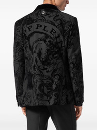 graphic-print blazer Highlights - Black - All-over graphic print - Front button fastening - Notched lapels - Brooch detail - Long sleeves - Jetted chest pocket - Applique logo - Two front welt pockets - Buttoned cuffs - Full lining - Straight hem Made in Italy Composition Outer: Cotton 100%, Polyester 53%, Virgin Wool 43%, Elastane 4% Lining: Viscose 51%, Acetate 49%