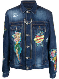 graphic-print denim jacket blue/multicolour cotton blend all-over graphic print classic collar front button fastening long sleeves front flap pockets Imported Composition Lining: Polyester 100% Outer: Cotton 100% SIZE & FIT Model measurements Height 6 ft 2 in(1.88 m) Bust/Chest 36.61 in(93 cm) Hips 35.82 in(91 cm) Waist 27.95 in(71 cm) Washing instructions Dry Clean Only