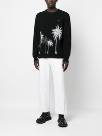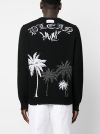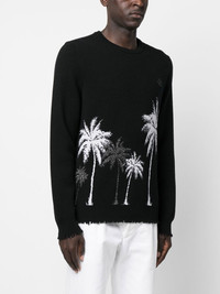 Hawaii jacquard wool pullover black merino wool blend jacquard logo motif logo patch to the rear crew neck long sleeves ribbed cuffs ribbed hem ripped detailing Made in Italy Composition Merino 95%, Metallized Polyester 5% SIZE & FIT Model measurements Height 6 ft 2 in(1.87 m) Bust/Chest 36.41 in(92.5 cm) Hips 37 in(94 cm) Waist 29.52 in(75 cm) FittingInformation This piece fits true to size. We recommend you get your regular size Cut for a relaxed fit Made with a mid-weight fabric Washing instructions Dry Clean Only
