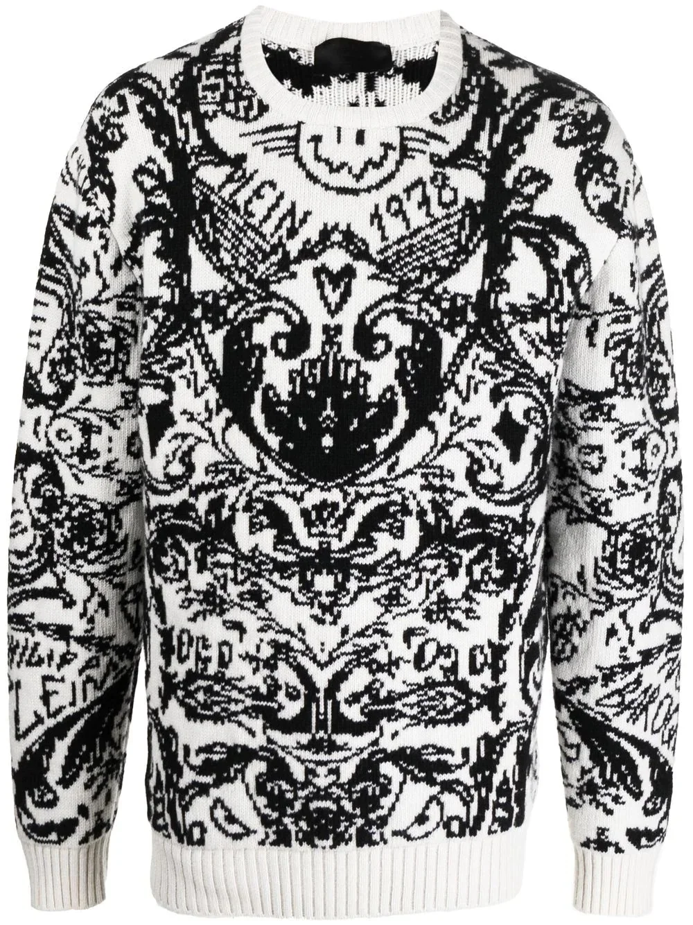 intarsia-knit design jumper white ribbed detailing intarsia knit two tone design round neck long sleeves straight hem Made in Italy Composition Outer: Lambs Wool 100% SIZE & FIT Model measurements Height 6 ft 2 in(1.88 m) Bust/Chest 36.61 in(93 cm) Hips 35.82 in(91 cm) Waist 27.95 in(71 cm) FittingInformation Designed to be unstructured, offering a loose fit throughout Made with a heavyweight knit, this piece offers some stretch This piece fits true to size – take your usual size Washing instructions Dry Clean Only