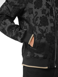 jacquard flowers bomber jacket Highlights - Black - Front zip fastening - Patterned jacquard - Logo patch at the chest - Two side slit pockets Made in Italy Composition Outer: Acetate 56%, Polyester 25%, Polyamide 13%, Elastane 3% Lining: Acetate 52%, Viscose 48% Washing instructions Read Manufacturer Guidelines