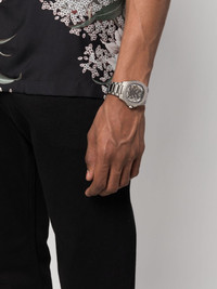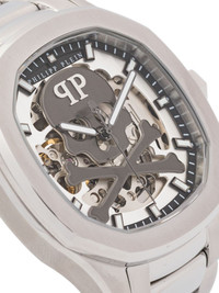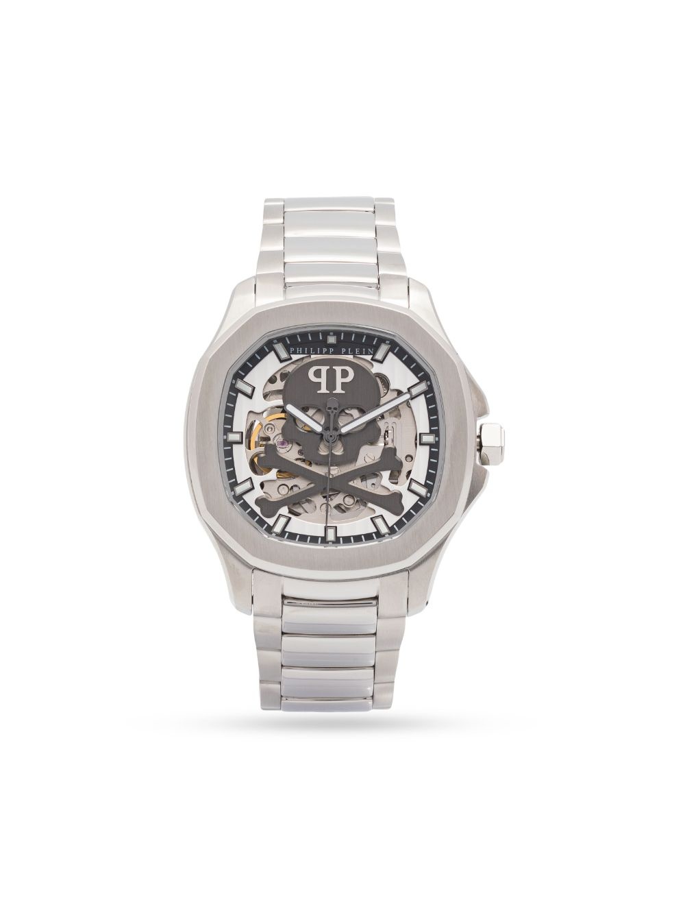 Skeleton Spectre 42mm An ode to Philipp Pleinâs expertise in watchmaking, this Skeleton Spectre 42mm is so-called thanks to the partially cut-out dial that exhibits the inner automatic movement. Itâs crafted from brushed stainless steel and finished with a signature skull motif that anchors the slender contrasting hands. Highlights - Stainless steel - Automatic movement - Index dial - Baton hands - Octagonal face - Skull appliquã© - Skeleton dial - Adjustable link bracelet - Clasp fastening - Central hours, minutes and seconds - Screw-down crown - Water resistance up to 50m/5 atm - This item comes with a standard one-year warranty from the brand. Imported Composition stainless steel 100% SIZE & FIT Model measurements Height 6 ft 2 in(1.87 m) Bust/Chest 36.6 in(93 cm) Hips 37 in(94 cm) Waist 28 in(71 cm) Measurement CIRCUMFERENCE 7.8 in(19.5 cm) DIAMETER 1.6 in(4 cm) Thickness 0.5 in(1 cm) WIDTH 0.9 in(2 cm)