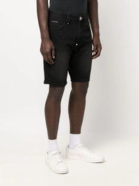 knee-length denim shorts knee-length denim shorts from PHILIPP PLEIN featuring black, cotton, logo patch to the rear, mid-rise, belt loops, concealed front fastening, classic five pockets and knee-length. Imported Composition Outer: Cotton 100% Lining: Polyester 65%, Cotton 35% Washing instructions Hand Wash